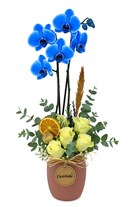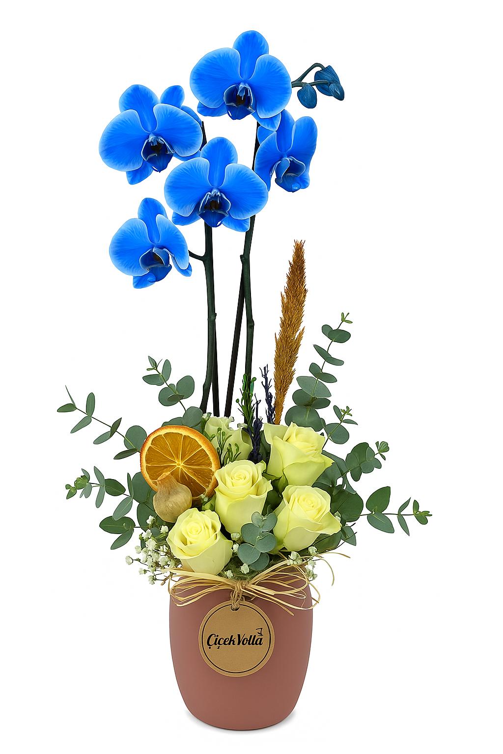 İddialı bir renk kontrastı ile göz kamaştıran bu aranjman; tropikal zarafetiyle mavi Phalaenopsis orkideler ve güneş gibi parlayan sarı güllerle bütünleşiyor. Eucalyptus yaprakları, kuru portakal dilimleri ve lavanta gibi doğal dokularla zenginleştirilen bu tasarım, modern ve sade bir seramik vazo içerisinde sunuluyor. Doğal ip ile bağlanmış “Çiçek Yolla” etiketli dokunuş, tasarıma el yapımı bir estetik katıyor. Hem özel günlerin yıldızı hem de şık dekorasyon objesi olarak fark yaratır.