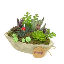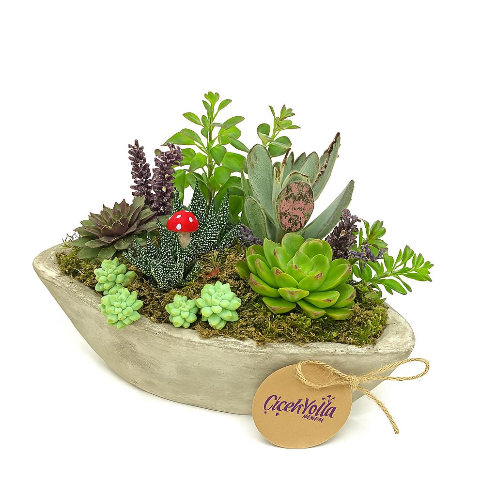 Melina Sukulent Dizayn, doğadan ilham alınarak özenle hazırlanmış bir minyatür bahçe görünümündedir. Beyaz seramik saksı içinde yer alan farklı türde sukulentler ve kaktüslerle oluşturulan bu özel tasarım, lavanta dalları, yosun dokuları ve minik dekoratif mantar figürüyle zenginleştirilmiştir. Dayanıklı yapısı ve az bakım gerektiren formuyla hem iç mekân dekorasyonu hem de anlamlı bir hediye alternatifi olarak öne çıkar. Ürün yüksekliği ortalama 18-22 cm’dir.