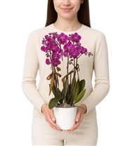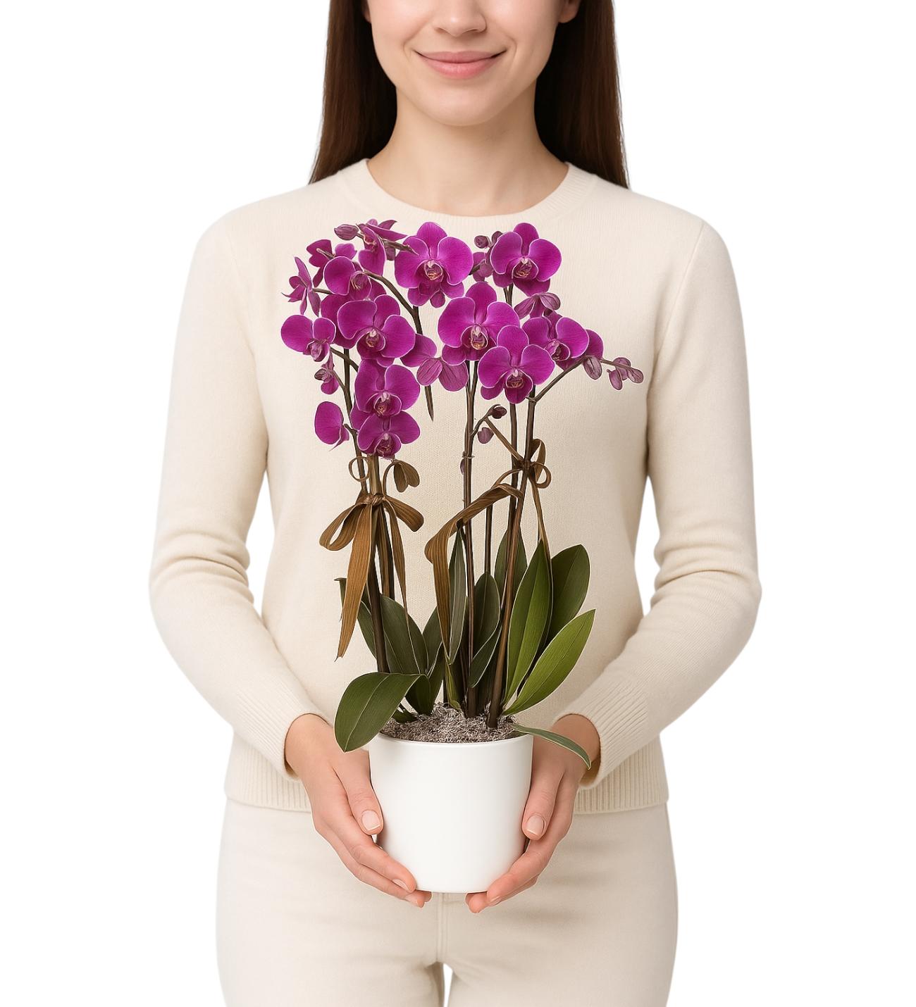 Zarafetin ve asaletin simgesi mor orkideler, beyaz seramik saksı içerisinde dört dallı formuyla özenle hazırlanmıştır. Göz alıcı rengiyle dikkat çeken bu orkide aranjmanı, özel günlerin anlamını artırmakla kalmaz; iç mekân dekorasyonlarına da şıklık ve huzur katar.