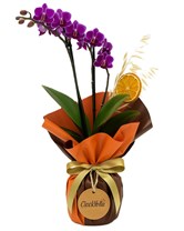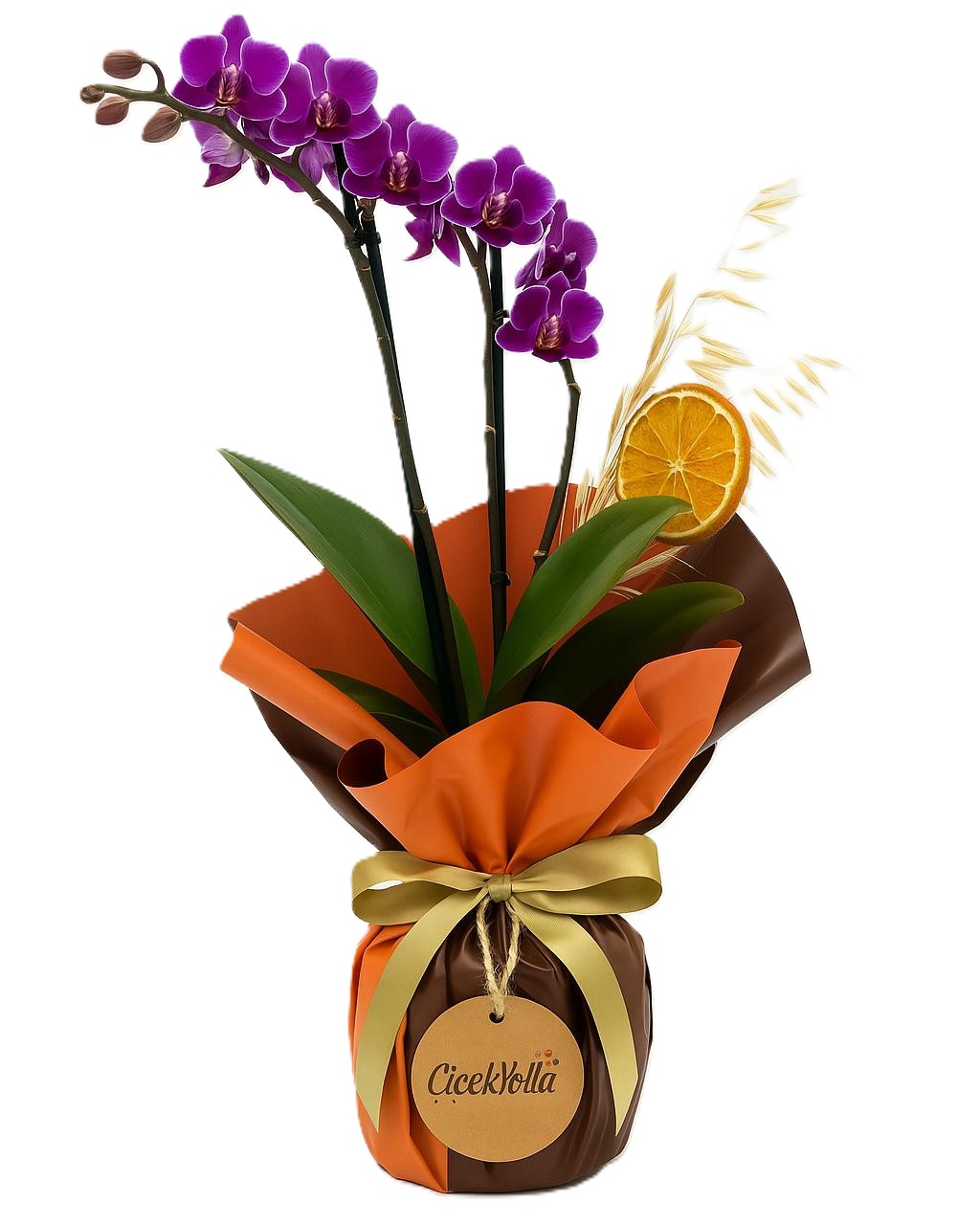 İkili midi boy mor Phalaenopsis orkide; canlı ve etkileyici çiçek formuyla, şık kahverengi ve turuncu saten ambalajla sarılarak göz alıcı bir görünüm kazanmıştır. Alt kısmı saten kurdeleyle bağlanmış ve Çiçek Yolla logosunun yer aldığı kraft yuvarlak etiketle detaylandırılmıştır. Aranjmanın içinde doğal portakal dilimi ve kuru yulaf başakları yer alır.