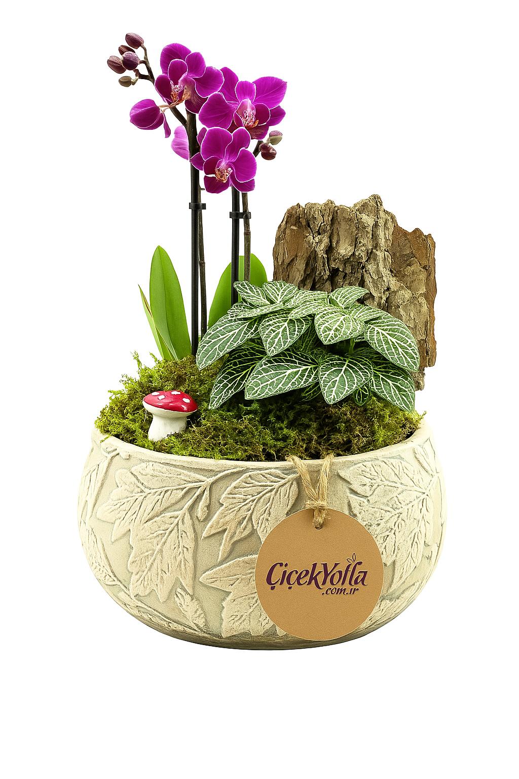 - Mini Orkide: Canlı pembe çiçekler ile dikkat çeker ve tasarımın odak noktasıdır.