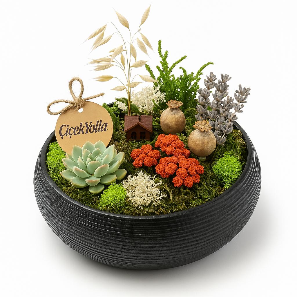 Bu minyatür bahçe, minik bir ev ile birlikte canlı renkler ve doğal bitkiler arasındaki uyumu yakalarak, bulunduğu her ortamda sakin ve huzurlu bir atmosfer yaratır. Kurutulmuş çiçekler, yosunlar ve doğal taşlar ile süslenen bu aranjman, ev dekorasyonu için ideal bir tercih sunuyor.