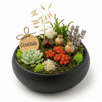 Şehir yaşamına doğanın huzurunu taşıyan Minyatür Bahçe ve Sukulent Aranjmanı, yeşilin tonları, doğal süslemeler ve minyatür ev ile zenginleştirilmiş, doğal güzellikleri bir araya getiriyor. Sukulentler, yeşil yosunlar, lavanta çiçekleri, kırmızı çiçekler ve minyatür ev ile tasarlanan bu özel aranjman, hem estetik hem de doğal dokularıyla göz kamaştırıcı bir görünüm sunuyor.