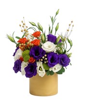Mor ve beyaz lisyantusların turuncu mini güllerle buluştuğu; yeşil button krizantem, cipsofilya ve kuru başak detaylarıyla zenginleştirilen modern seramik aranjman. Enerjik ve zamansız bir dokunuş arayanlar için ideal.