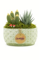 Aranjmanda kullanılan farklı kaktüs türleri, doğal yosun dokusu ve sevimli mantar figürleri, hem modern hem de doğal bir estetik katarın bulunduğu yerde kullanılıyor. Desenli saksının şık tasarımı, aranjmanı her yönden göz alıcı ünitesi ve her yeri dikkat çeken bir parça haline getirilir.