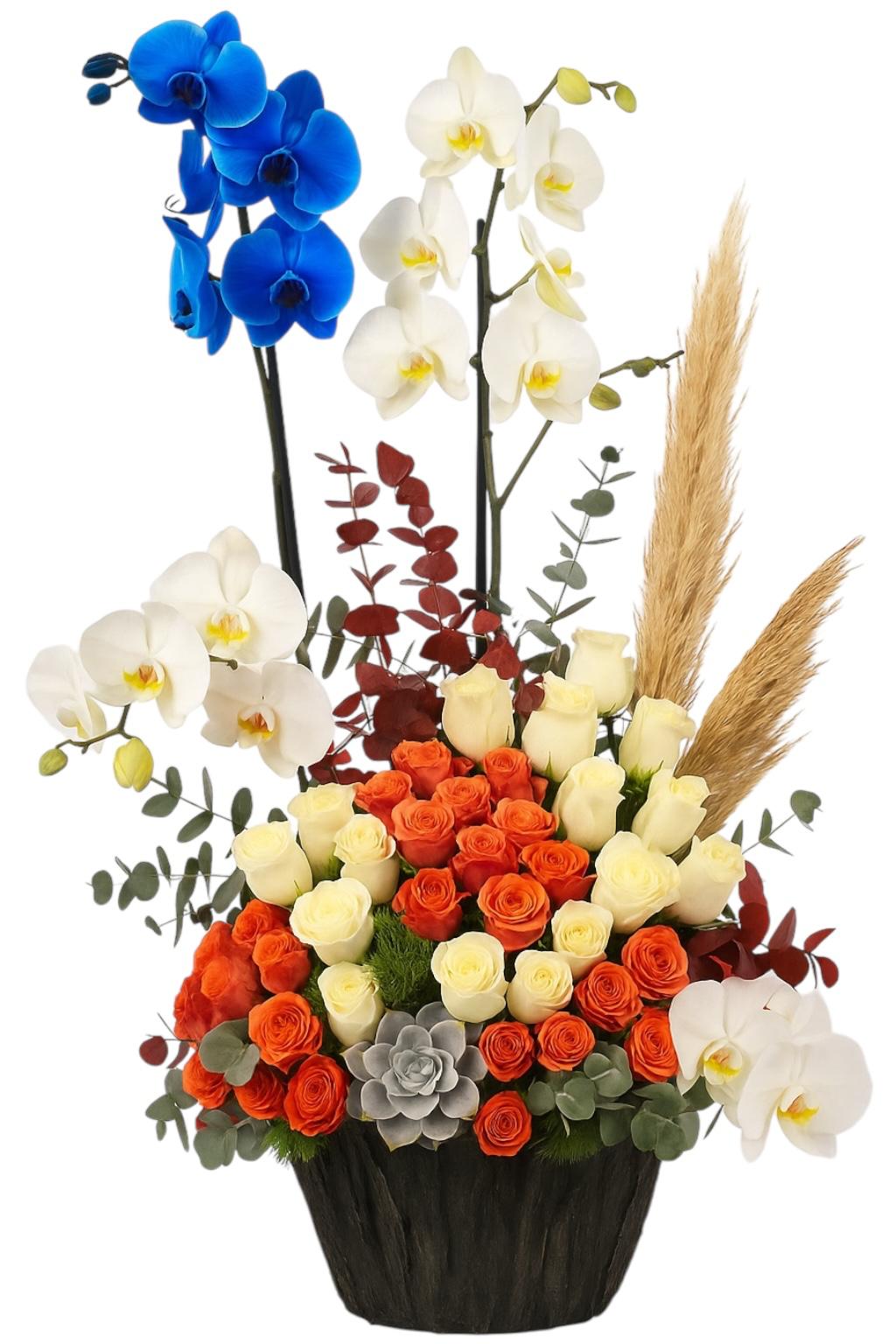 Ürün Boyutu : Yükseklik:60 cm, genişlik:50 cm Kullanılan Malzemeler : 2 dal beyaz orkide,,2 dal mavi , 15 adet Çardak gülü, 1 adet sukulent 17 adet krem gül orbis ve mevsim çiçekleri,pampas ve lilyumlar Orkide Aydınlık bir ortamda bulunmalıdır. Klimalı yerlerden uzak durmalıdır. Ev ve İş ortamınıza doğallık ve şıklık katacak bir tasarımdır. Orkide yaklaşık 60cm'dir. saksı uzunluğu 35x10 cm'dir.