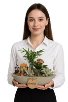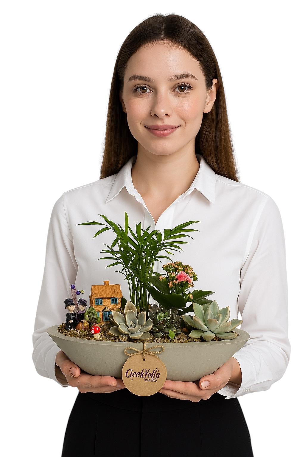 Oval formda doğal beton saksı içinde sunulan bu mini bahçe, Chamaedorea palmiyesi, rengarenk Kalanchoe, farklı türde sukulentler ve minyatür figürlerle birlikte eşsiz bir dekoratif obje sunuyor. Masalsı dokusuyla hem ev hem ofislerde göz alıcı bir köşe yaratmak isteyenler için idealdir. Özellikle doğum günleri, tebrik hediyesi veya yeni iş kutlaması için tercih edilen bu ürün, Çiçek Yolla kalitesiyle İstanbul içi aynı gün, Türkiye geneli ise hızlı kargo seçeneğiyle gönderilmektedir.