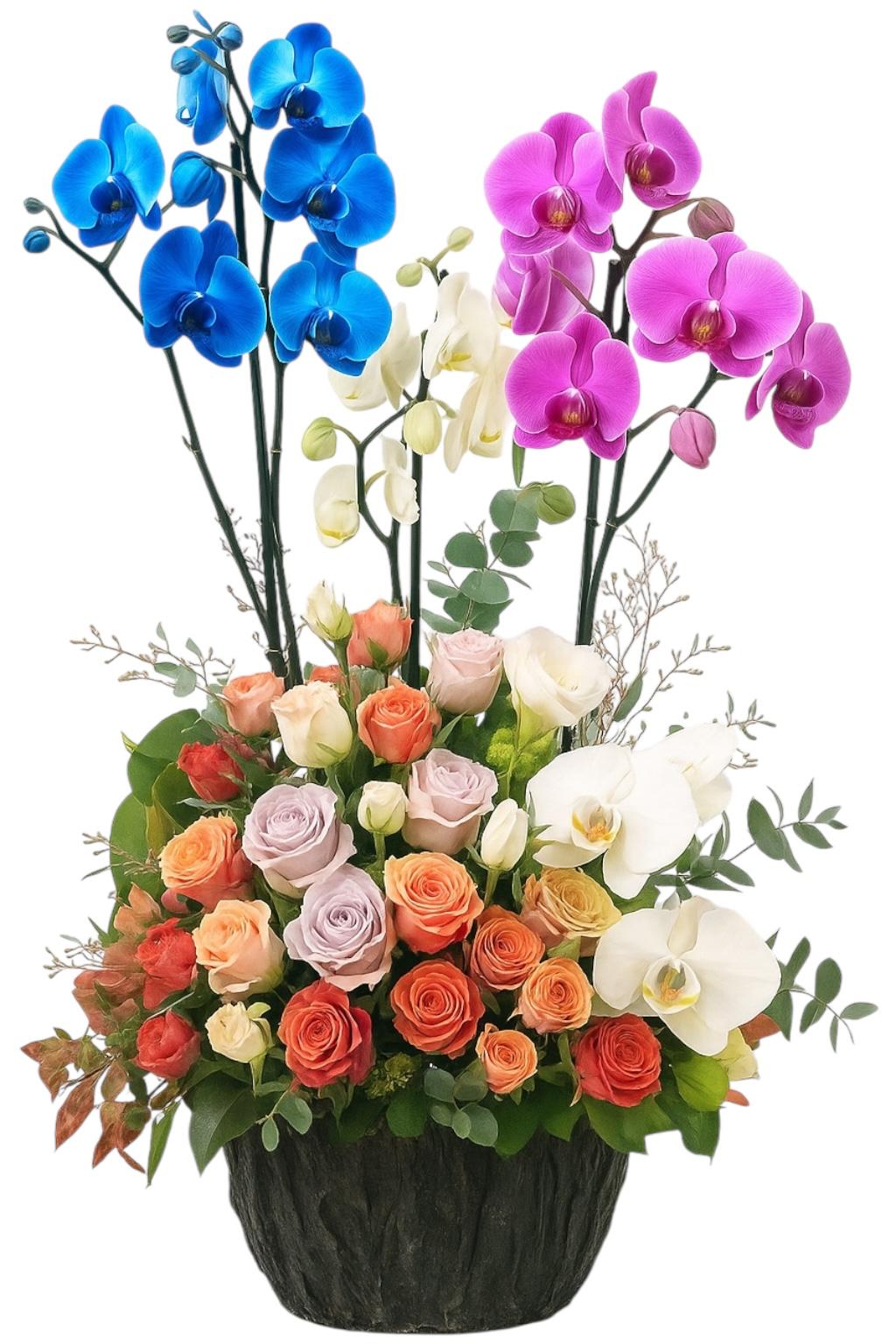 Ürün Boyutu : Yükseklik:60 cm, genişlik:50 cm Kullanılan Malzemeler : 2 dal beyaz orkide,2dal mor,2 dal mavi , 15 adet çardak gül, 7 adet krem gül ve mevsim çiçekleri,pampas ve lilyumlar Orkide Aydınlık bir ortamda bulunmalıdır. Klimalı yerlerden uzak durmalıdır. Ev ve İş ortamınıza doğallık ve şıklık katacak bir tasarımdır. Orkide yaklaşık 60cm'dir. saksı uzunluğu 35x10 cm'dir.