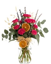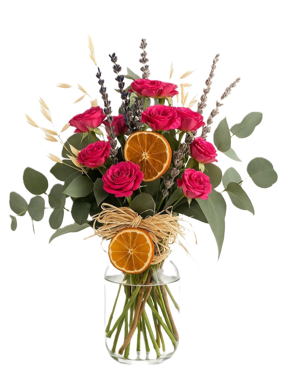 Bu zarif aranjman, taze pembe güller, lavanta ve doğal portakal dilimleriyle hazırlanmış, doğal dokusu ve şıklığı birleştiren mükemmel bir tasarımdır. Pembe güllerin romantik havası, lavantaların huzur veren kokusu ve turuncu portakal dilimlerinin enerjik rengiyle dengelenmiştir. Şeffaf cam vazoya yerleştirilen bu şık aranjman, rustik ip ve doğal detaylarla tamamlanmıştır. Hem doğallığı hem de zarafetiyle, sevdiklerinize anlamlı ve göz alıcı bir hediye sunmanızı sağlar.
