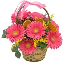 Günün enerjisini yükselten, iç açıcı bir görünüm arayanlar için tasarlanan bu sepet; 9 adet canlı pembe gerbera, sarı mimozalar, yeşil yapraklar ve kuru portakal dilimleriyle hayat buldu. Hasır görünümlü doğal sepet içinde hazırlanan bu şık aranjman, pembe kurdele detayı ve doğal iple bağlanmış “Çiçek Yolla” etiketiyle sıcak ve samimi bir hava yaratır. Neşeli, renkli ve enerjik bir hediye seçeneği arayanlar için birebir.