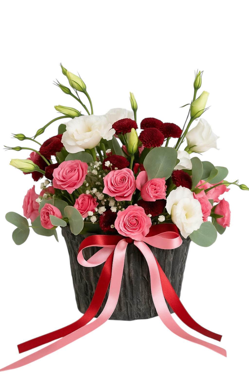 Pembe güllerin zarafeti, bordo pompon krizantemlerin derin rengi ve beyaz lisyantusların yumuşak dokusuyla buluşuyor. Cipsofilya ve okaliptus yapraklarıyla tamamlanan bu aranjman, siyah dokulu saksısı ve iki renkli saten kurdelesiyle romantik ve modern bir hava sunar.