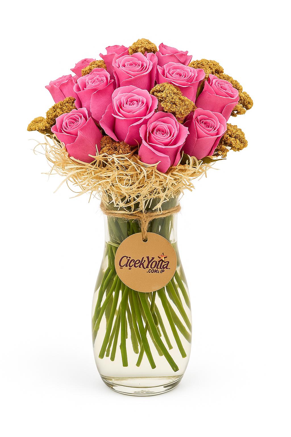 Pembe güllerin romantik dokusu, kurutulmuş çiçekler ve rafya ile süslenerek zarif bir bütünlük yaratıyor. Şeffaf cam vazo, çiçeklerin güzelliğini ön plana çıkarırken doğal ve şık bir görünüm sunuyor.