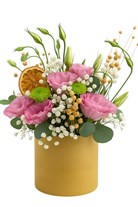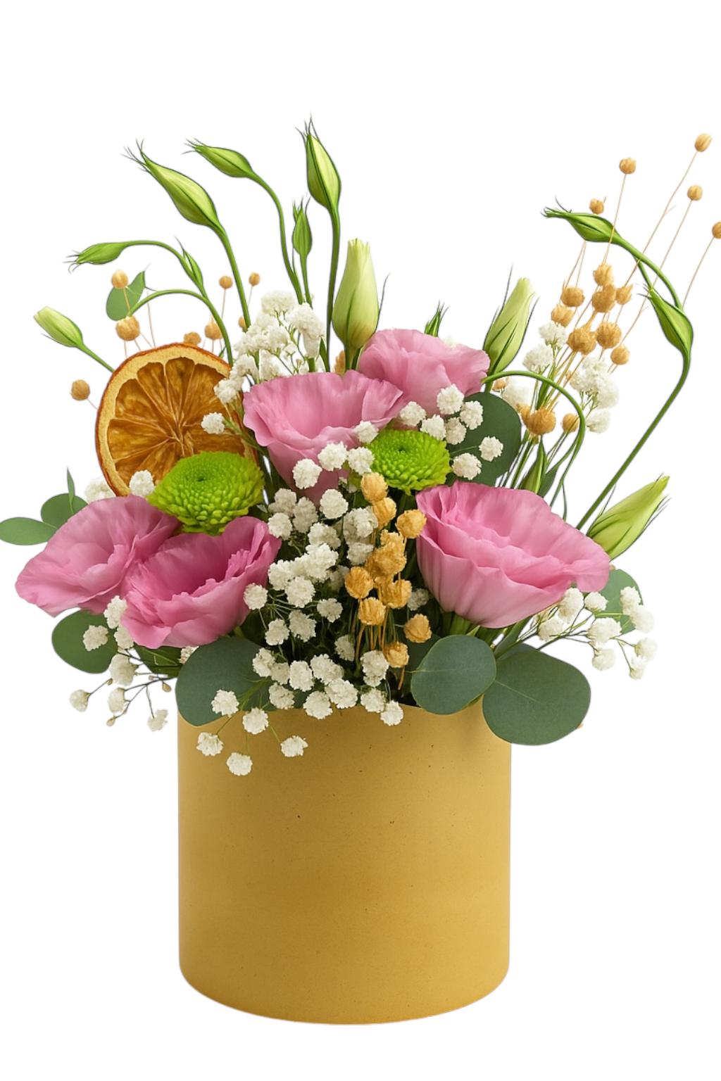 Pembe lisyantusların cipsofilya bulutları, yeşil buton krizantem ve doğal kuru çiçeklerle buluştuğu; kurutulmuş portakal dilimiyle tamamlanan modern seramik aranjman. Sıcak, doğal ve çok şık.