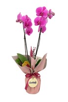 İki dallı pembe orkide çiçeklerinin zarafeti, kurutulmuş portakal dilimleri, yapraklar ve renkli süslemelerle desteklenerek doğal bir güzellik oluşturuyor. Şık ambalajı, orkidenin zarif yapısını taçlandırırken, turuncu kurdele ile tasarımı tamamlıyor.