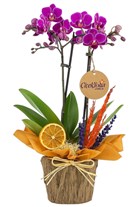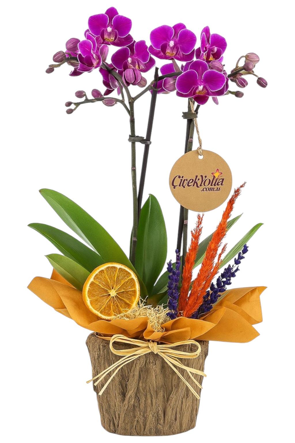 Doğanın en zarif çiçeklerinden olan mor Phalaenopsis orkide, bu kez rustik bir tarzla karşınızda! Kütük dokulu saksı içerisinde sunulan 2 dallı canlı mor orkide, etkileyici görüntüsünü kurutulmuş lavanta, portakal dilimi ve turuncu lagurus gibi doğal detaylarla tamamlıyor. Saksının çevresini saran hardal rengi kâğıt ve rafya bağlama, sunumu hem doğal hem de sıcak kılıyor. Çiçek Yolla’nın naturel etiket dokunuşu ile tamamlanan bu tasarım; kurumsal hediyelerden doğum günü kutlamalarına, yeni iş tebriğinden ev hediyelerine kadar pek çok anlamlı anda eşlik edebilecek kadar şık ve kalıcı.