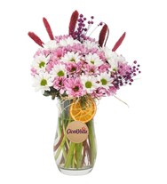 Pembe ve beyaz papatyaların zarif uyumuyla hazırlanan bu özel aranjman, cam vazo içerisinde doğal detaylarla zenginleştirildi. Mor top süslemeler, kırmızı başaklar ve kurutulmuş portakal dilimleriyle hareketlendirilen tasarım, hem romantik hem de enerjik bir hediye alternatifi sunuyor. Günlük yaşamı renklendirmek, sevdiklerinize sürpriz yapmak veya dekorasyonunuza canlılık katmak için ideal bir seçimdir.