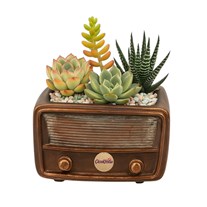 Retro radyo şeklinde tasarlanmış saksı içerisinde zarif sukulent aranjmanı. Aranjmanda, yeşil ve mor tonlarındaki sukulentler ve doğal taşlar kullanılarak şık bir düzenleme oluşturulmuş. Vintage tarzı ile dikkat çeken bu bitki, ev ve ofis dekorasyonuna nostaljik bir dokunuş katacak. Düşük bakım gereksinimi ile hem estetik hem de pratik bir seçenek.