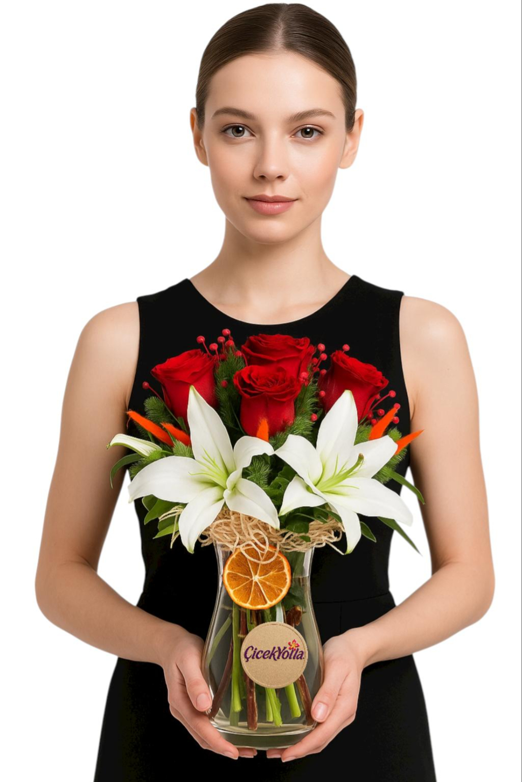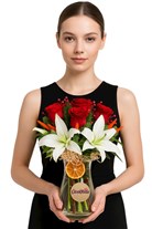 Aşkın simgesi kırmızı güller ile saflığın sembolü beyaz lilyumların buluştuğu bu özel aranjman, cam vazo içerisinde şık bir tasarımla sunuluyor. Kurutulmuş portakal dilimi ve doğal süslemelerle tamamlanan bu aranjman, romantik bir ifade taşıdığı kadar zarif bir hediye alternatifi de sunar. Sevgililer Günü, yıldönümü veya özel günlerde sevdiklerinizi mutlu etmenin en zarif yolu.