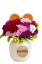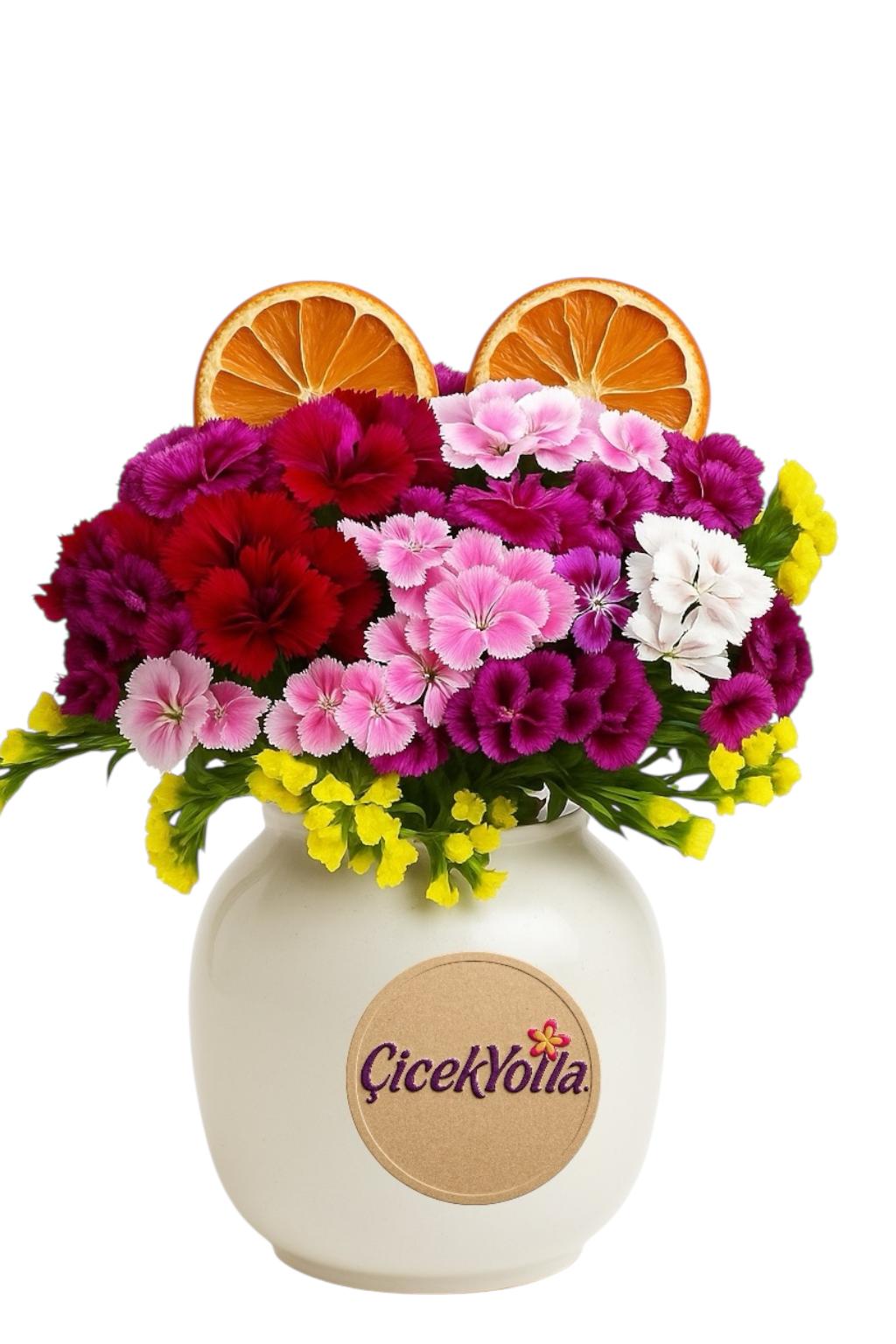 Renkli hüsnü yusuf çiçekleri, beyaz bir saksı içinde zarif bir şekilde düzenlenmiş. Mor, kırmızı, beyaz, pembe ve sarı tonlarındaki karanfil çiçekleri, görsel zenginlik ve canlılık katıyor. Üst kısımdaki dekoratif portakal dilimleri ise aranjmana taze ve doğal bir dokunuş ekliyor. Hem iç mekanlarda hem de masa süslemesi olarak kullanılabilecek bu şık aranjman, hediye olarak da mükemmel bir seçenek.