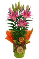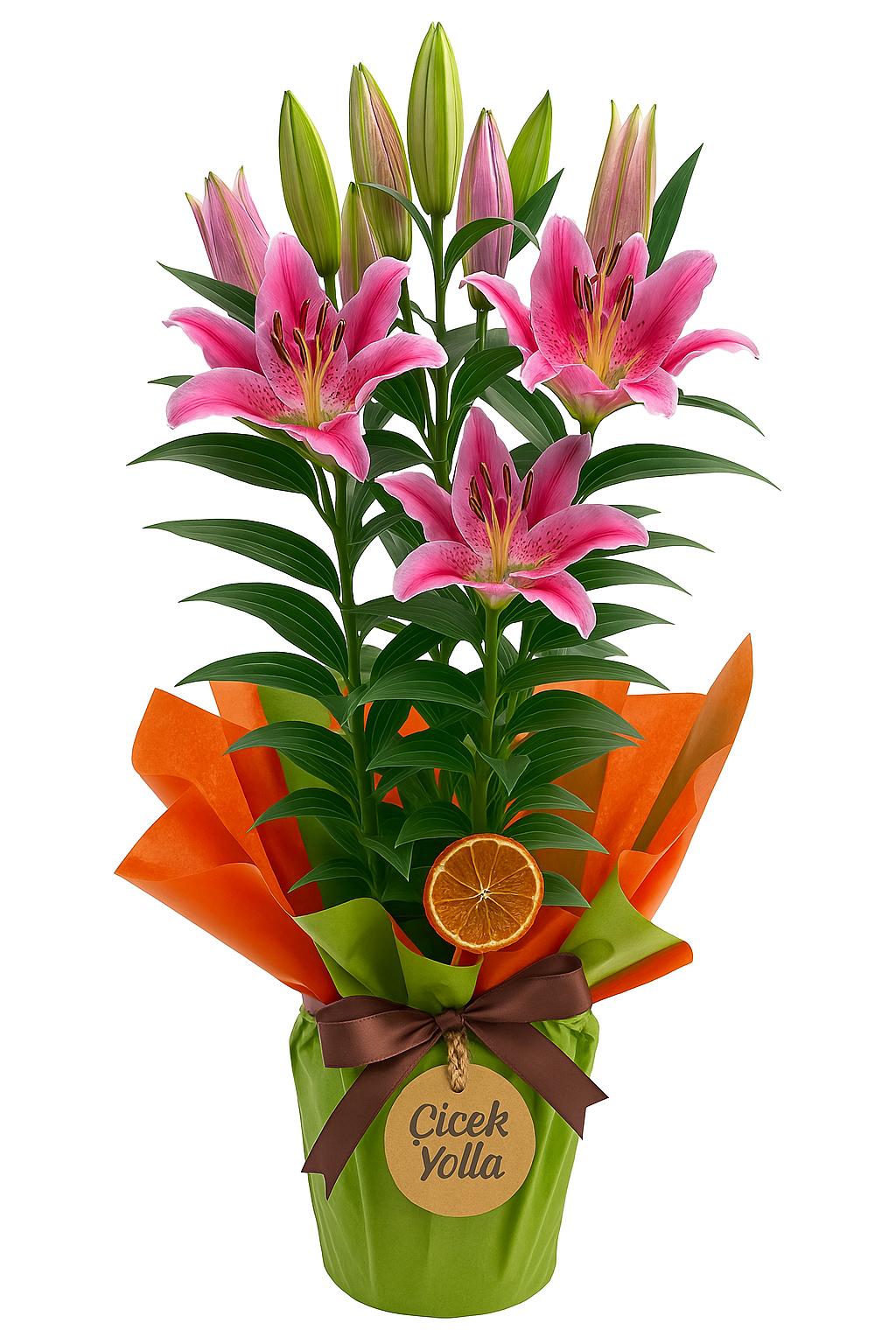 Canlı pembe lilyumlardan oluşan bu zarif tasarım, yeşil saksı ambalajı ve içeriğindeki turuncu-pembe kombinasyonlu kağıtlarla tamamlanmıştır. Yoğun çiçek dokusu, açmış lilyumlarla tomurcukların dengeli birleşiminden oluşur. Alt kısımda doğal rafya ip ile bağlanmış kraft etiket üzerinde “Çiçek Yolla” logosu yer alır. Yan kısımlar kuru portakal dilimi ve kahverengi saten kurdele ile süslenmiştir.
