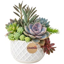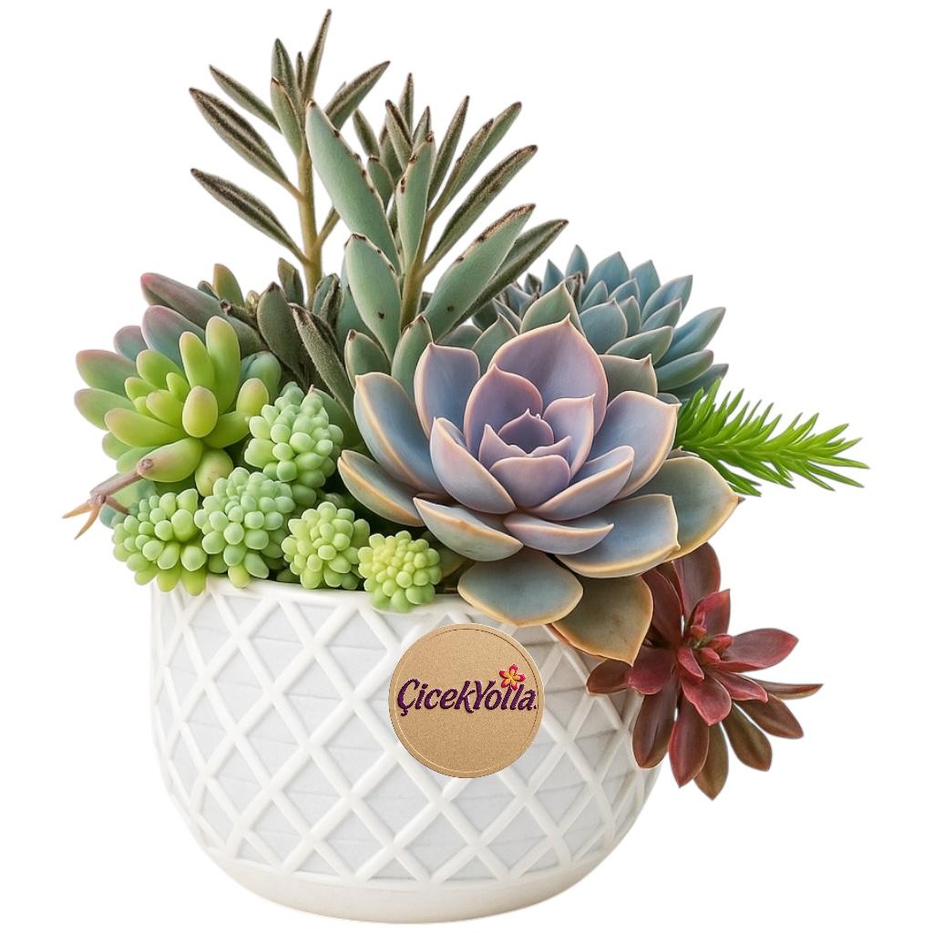Farklı form ve renklerdeki sukulentlerin bir araya geldiği bu neşeli düzenleme, beyaz desenli seramik saksısı ile modern ve dinamik bir masaüstü bahçesi sunar. Kolay bakımı ve çarpıcı renkleriyle hem ev hem de ofis için ideal bir dekoratif çözümdür.