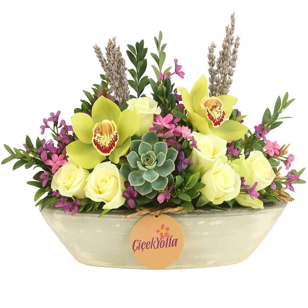 Bu zarif çiçek aranjmanı, doğanın güzelliklerini modern bir tasarımla bir araya getiriyor. Beton saksı içerisinde sunulan bu olağandışı düzensizlikler, sarı orkide çiçekleri, yeşil sukulentler, beyaz güller, mor lavanta dalları ve pembe dokunuşlarla göz alıcı bir görünüm sunuyor. Her bir detay, sadelik ve şıklığın uyumunu yansıtmak için seçilmiştir.