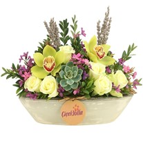 Sarı orkidenin enerjisi ve sukulentin modern dokunuşuyla harmanlanan bu çiçek aranjmanı, zevke hitap eden şık bir tasarım sunuyor. Doğal beton depolamasıyla, hem sade hem de farklı tarzlarda tasarımlar yaratılıyor. Sarı orkideler, neşe ve mutluluk temsil ederken, yeşil sukulentler huzurlu bir denge katıyor. Beyaz güller ve mor lavanta dalları, bu zarif aranjmana ferahlatıcı bir dokunuş ekliyor.