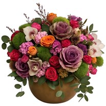 Senta Özel cam İçerisinde ithal mini güller 7 adet ithal Pembe gül astomerya ,okaliptus lila orkide ve mevsim çiçeklerinden 30 cm Yükseklikte 30 cm genişlikte güzel bir canlı kesme çiçek tasarımı