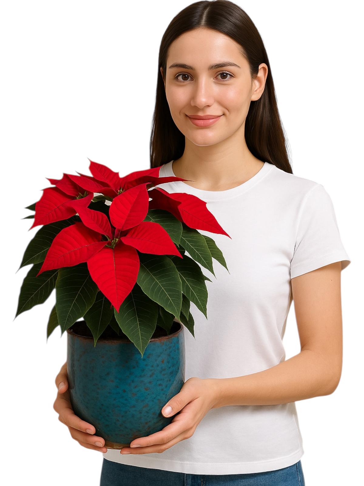 Atatürk Çiçeği olarak da bilinen Poinsettia, kırmızı yapraklarıyla yılbaşı döneminin sembol çiçeklerinden biridir. Gösterişli yaprakları ve zarif duruşuyla dikkat çeken bu bitki, özellikle kış aylarında iç mekanlara sıcaklık ve renk katar. Lacivert tonlarında seramik saksısıyla şık bir duruş sergiler.