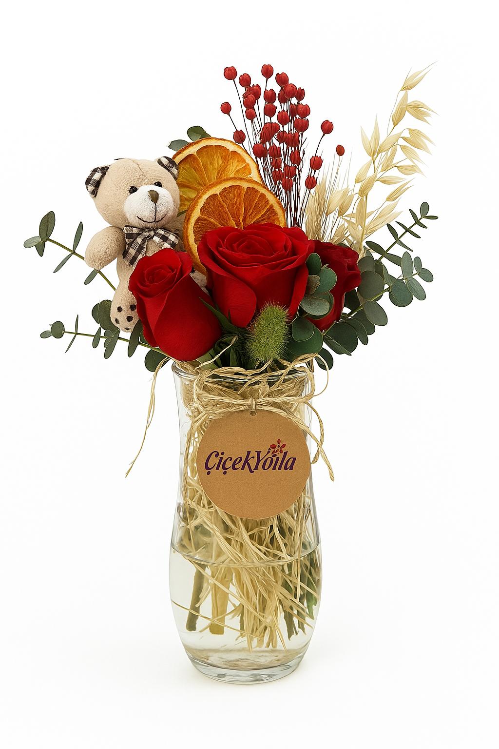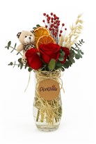Sevimli Ayıcıklı Kırmızı Gül Serisi şeffaf bir cam vazo içerisinde yer alan zarif bir çiçek düzenlemesi bulunmaktadır. Bu aranjmanda, kırmızı güller, kuru portakal dilimleri ve çeşitli dekoratif otlar öne çıkmaktadır. Buketin yanında sevimli bir peluş ayıcık da yer alarak, düzenlemeye sevimli ve sıcak bir dokunuş katmaktadır. Kırmızı güller, romantizmi ve tutkuyu simgelerken, kuru portakal dilimleri ve otlar doğal bir estetik sağlar. Bu çiçek düzenlemesi, hem özel günlerde hediye olarak hem de ev veya ofis dekorasyonunda şıklık katmak için mükemmel bir seçimdir.