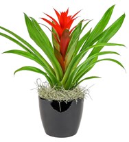 Parlak kırmızı çiçek gövdesi ve canlı yeşil yapraklarıyla dikkat çeken Guzmanya, tropikal bitkilerin zarafetini evinize veya ofisinize taşır. Siyah parlak seramik saksısı ile modern ve şık bir görünüm sunar. Uzun ömürlü ve kolay bakımlı yapısıyla hem dekorasyon hem de hediye amaçlı kullanım için idealdir. Yaklaşık 35-45 cm yüksekliğindedir.