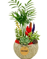 Yüksek kaliteli taş kap, doğal bitkiler ve dekoratif yöntemlerle hazırlanmış bu aranjman, ofisler, evler veya iş yerleri için mükemmel bir tercih olacak. Ayrıca yapay minik çiçekler ve şık detaylar da aranjmana estetik bir görünüm kazandırıyor.