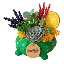 Bu benzersiz aranjman, canlı sukulentlerin dayanıklı yapısı ve kuru çiçeklerin estetik dokunuşuyla doğanın eşsiz güzelliğini yansıtıyor. Kaktüs formunda tasarlanmış özel seramik saksısı, dekoratif bir görünüm sunarken, kurutulmuş lavanta, turuncu yosun ve kuru narenciye dilimleriyle zarif bir kontrast oluşturuyor.