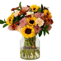 Cam vazo içerisinde hazırlanan bu enerjik çiçek aranjmanı; güneş gibi parlayan 5 adet ayçiçeği, somon tonlarında karanfiller, pembe krizantemler ve turuncu tonlarında minik kasımpatılarla oluşturulmuştur. Aranjman, doğal yeşilliklerle desteklenerek daha hacimli ve dengeli bir görünüm kazanmıştır. Ortalama yüksekliği 35-40 cm’dir. Hem iç mekân dekorasyonu için ideal bir tercih, hem de sevdiklerinize neşeli bir gün yaşatmak için harika bir hediye seçeneğidir.