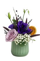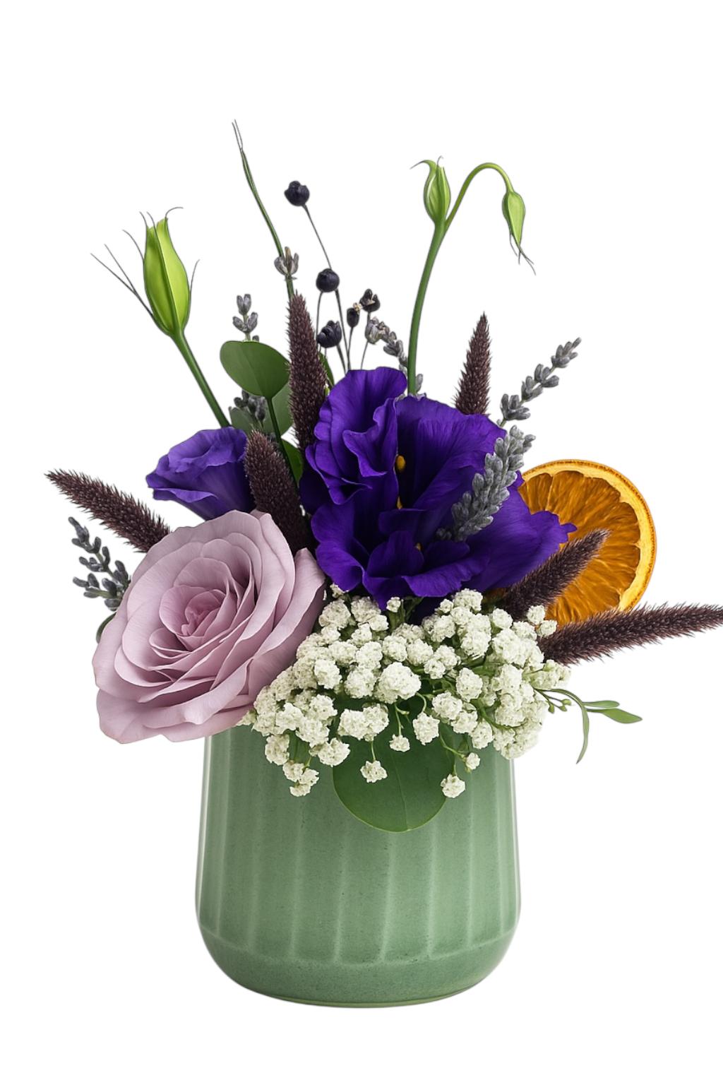 Derin mor lisyantuslar, lila gül ve cipsofilyanın doğal kuru detaylar ve portakal dilimiyle buluştuğu modern yeşil seramik aranjman. Karizmatik, zarif ve özgün.