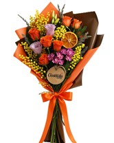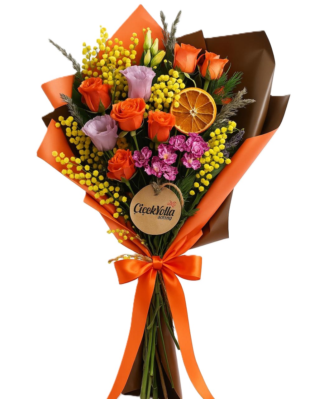 Canlı turuncu güller, zarif lila güller, sarı mimosa çiçekleri ve pembe çiçekler ile tasarlanmış bu buket, doğanın en güzel renklerini bir araya getiriyor. Buket, kurutulmuş portakal dilimleriyle zenginleştirilerek hoş bir doğallık ve sıcaklık sunuyor.