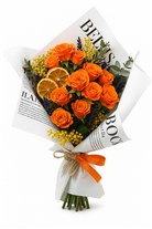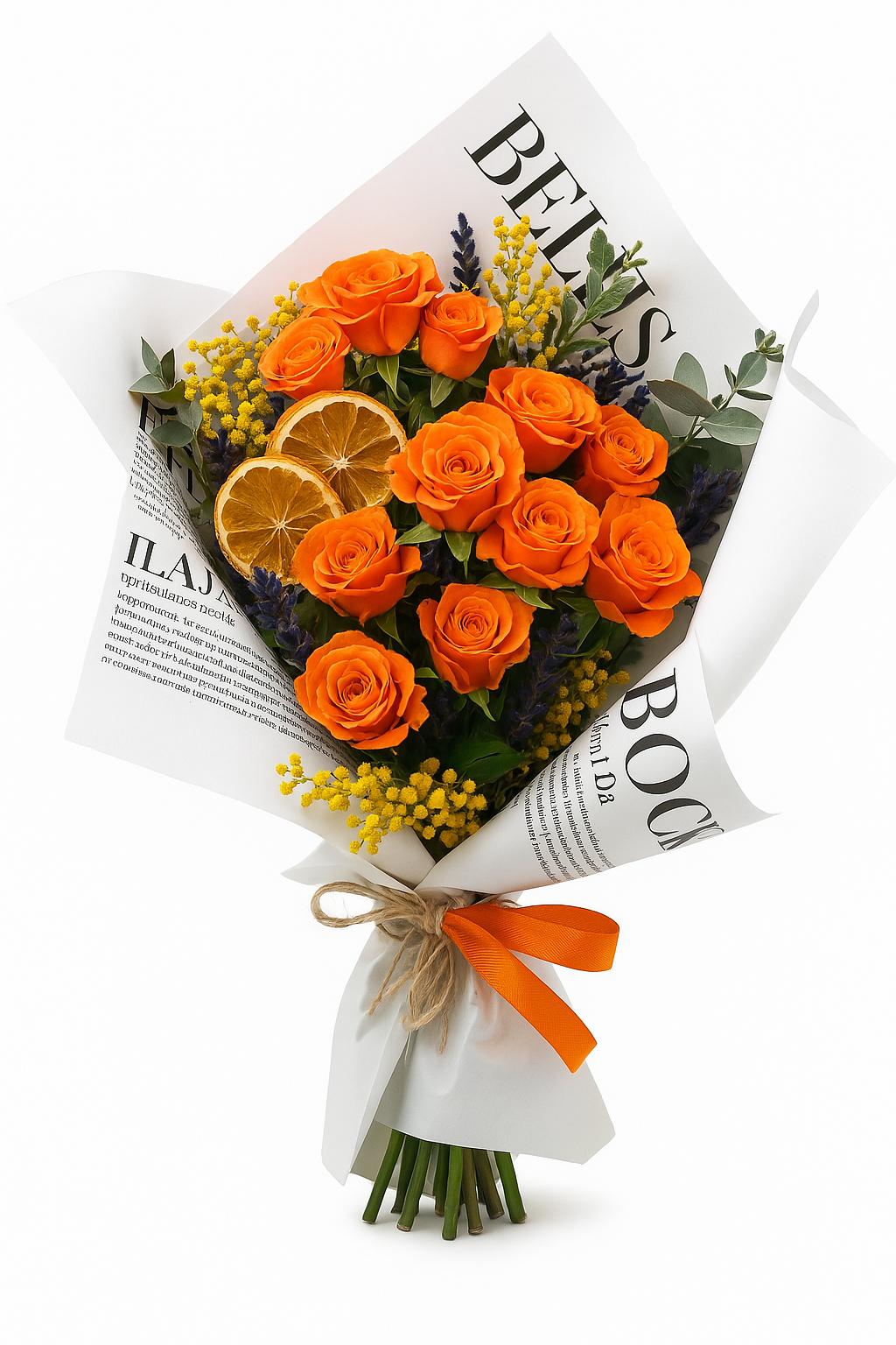 Turuncu güllerin sıcak tonları, sarı mimoza çiçekleri ve kurutulmuş portakal dilimleri ile tamamlanarak dinamik ve dikkat çekici bir buket yaratılmıştır. Lavanta ve okaliptus yaprakları, doğallığı ön plana çıkarırken, gazete desenli ambalajı ile bukete modern bir hava katıyor.