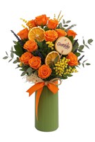 Canlı turuncu güllerin sıcaklığı ve doğallığın zarafetiyle hazırlanan bu özel vazo aranjmanı, hem şıklığı hem de enerjisiyle dikkat çekiyor. Vazonun içerisinde yer alan turuncu güller, lavanta, sarı başak çiçekleri ve kuru portakal dilimleriyle tamamlanarak harika bir renk armonisi yaratıyor. Eucalyptus yaprakları ve doğal rafya, aranjmanın doğal havasını pekiştiriyor.