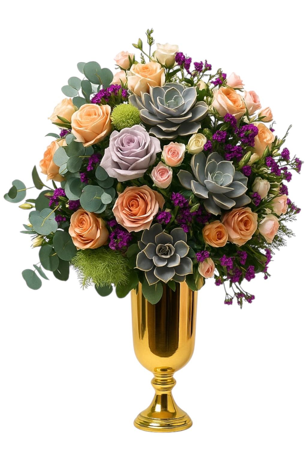 Gold Vazo İçeriside Ürün Yüksekliği 60cm Sevdiklerinizi göz alıcı güzellikte bir çiçek ile mutlu etmek ister misiniz? "Evet" dediğinizi duyar gibiyiz. O halde şu anda tam da ihtiyacınız olan tasarımı inceliyorsunuz demektir. 15 adet özel kesme soft güller, 9 adet lila renkli gül, sukulent, Hiperikum, celosya ve yeşillikler kullanarak oluşturduğumuz "Butik Tasarım" güzelliği ile, gönderdiğiniz kişinin gözlerini alacak ve onu fazlasıyla mutlu edecektir. eğer hem göze hem de gönüle hitap etmek isterseniz bunu yapabileceğiniz en iyi tasarım dır.