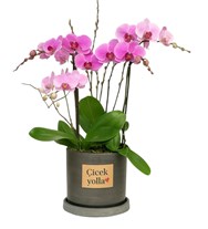 Canlı renkleri ve zarif duruşuyla göz kamaştıran fuşya ve açık pembe Phalaenopsis orkide aranjmanı, şık siyah seramik saksı içinde sunuluyor. Hem sevdiklerinize hediye etmek hem de yaşam alanlarınıza renk katmak için ideal bir seçim.