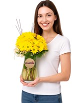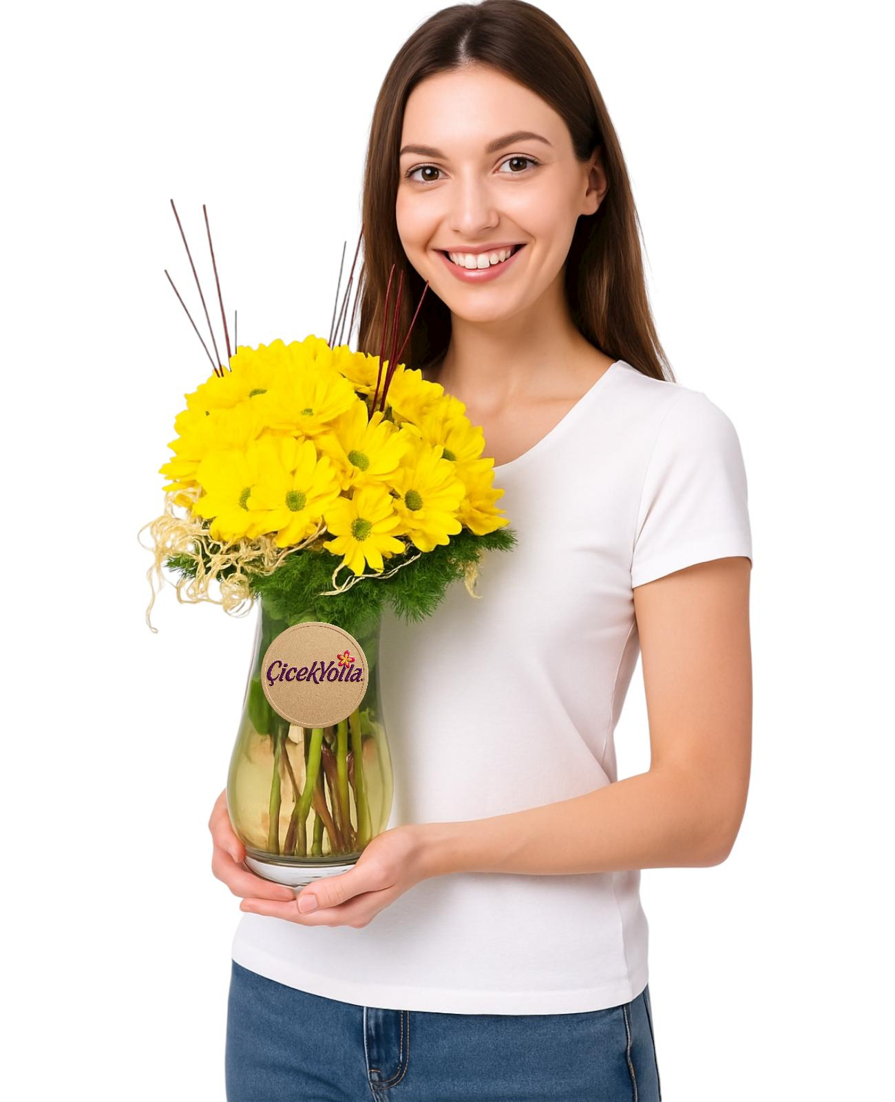 Neşenin ve pozitif enerjinin simgesi sarı papatyalar, cam vazo içerisinde sade ve zarif bir şekilde sunuluyor. Doğal yeşillikler ve dekoratif çubuklarla tamamlanan bu aranjman, hem ev hem de ofis ortamına güneşin enerjisini taşır. Sevdiklerinize mutluluk vermek veya özel günlerde samimi bir sürpriz yapmak için harika bir tercihtir.