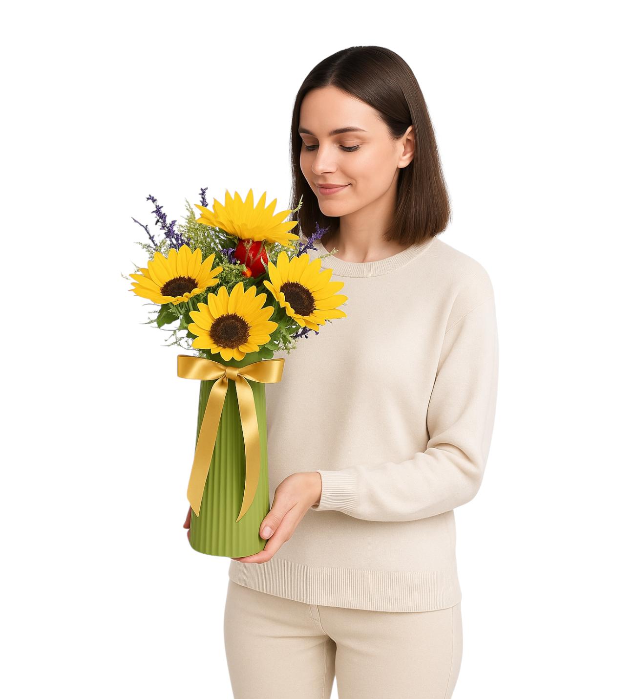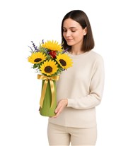 Pozitifliğin ve enerjinin sembolü ayçiçekleri, “Güneşe Merhaba” aranjmanında hayat buluyor. 5 adet büyük ayçiçeği, lavanta dalları, kırmızı kuru çiçek dokunuşu ve solidago ile harmanlanarak şık bir kompozisyon oluşturuyor. Doğal tonlardaki yeşil seramik vazo ve altın rengi kurdele detayıyla tamamlanan bu tasarım; neşe dolu bir sürpriz ya da dekoratif bir mutluluk kaynağı arayanlar için ideal.